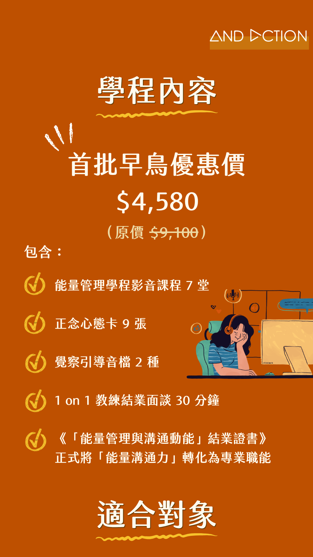如果你不想立即發展個人教練身份,也沒有想要直接培養引導對話影響力,而是想要聚焦於眼前現狀,期待明確解決某項煩惱,同時依然對「Life Coach」、「教練力」、「Coaching Mindset」感到熱忱好奇或躍躍欲試,那麼《AndAction 學程計劃》會是非常適合你的選擇。藉由緊密又有彈性的系統性安排,加速融會貫通,邁向全方位的新時代工作者!