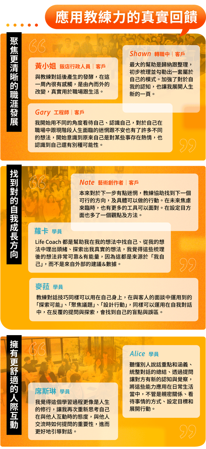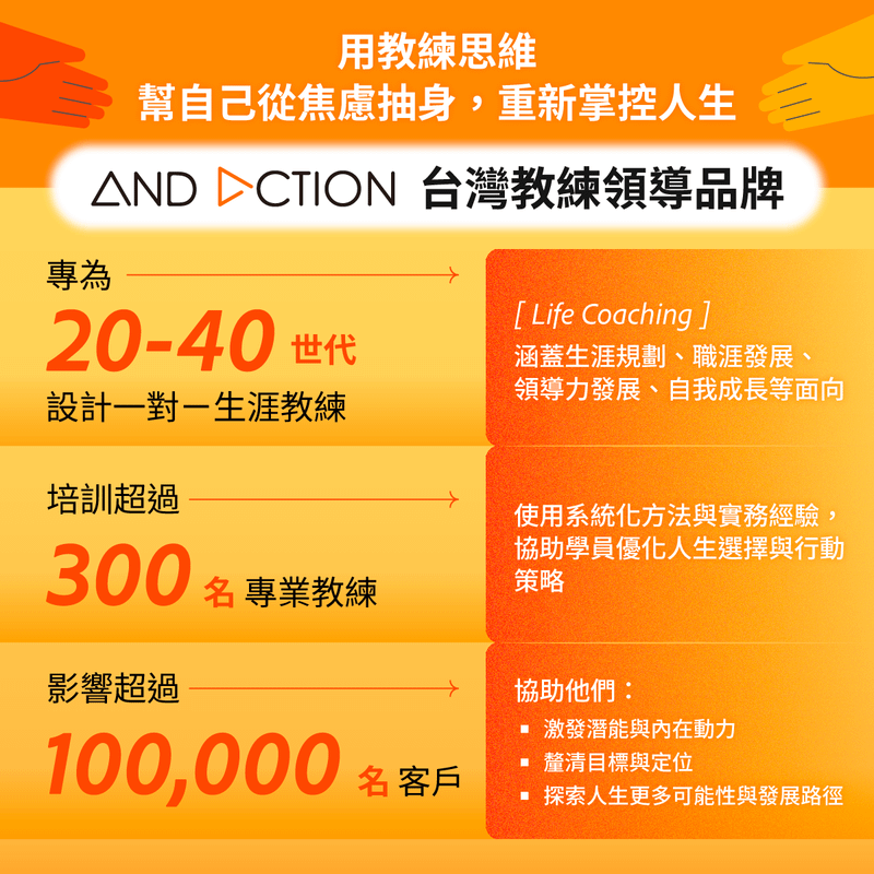 於個人發展領域深耕 13+ 年,每年培訓超過百位學員學習教練技術,於國內外受邀舉行逾千場講座/內訓/工作坊,一對一短期/長期深度諮詢服務已支持數千位客戶突破個人發展期待、拓展實踐事業/專案、梳理人際關係及當下狀態調整。延伸結合SaaS服務、數位內容、原創心理學與教練 AI 工具等,受邀書籍出版共累計影響 100,000+ 名以上新時代工作者們。