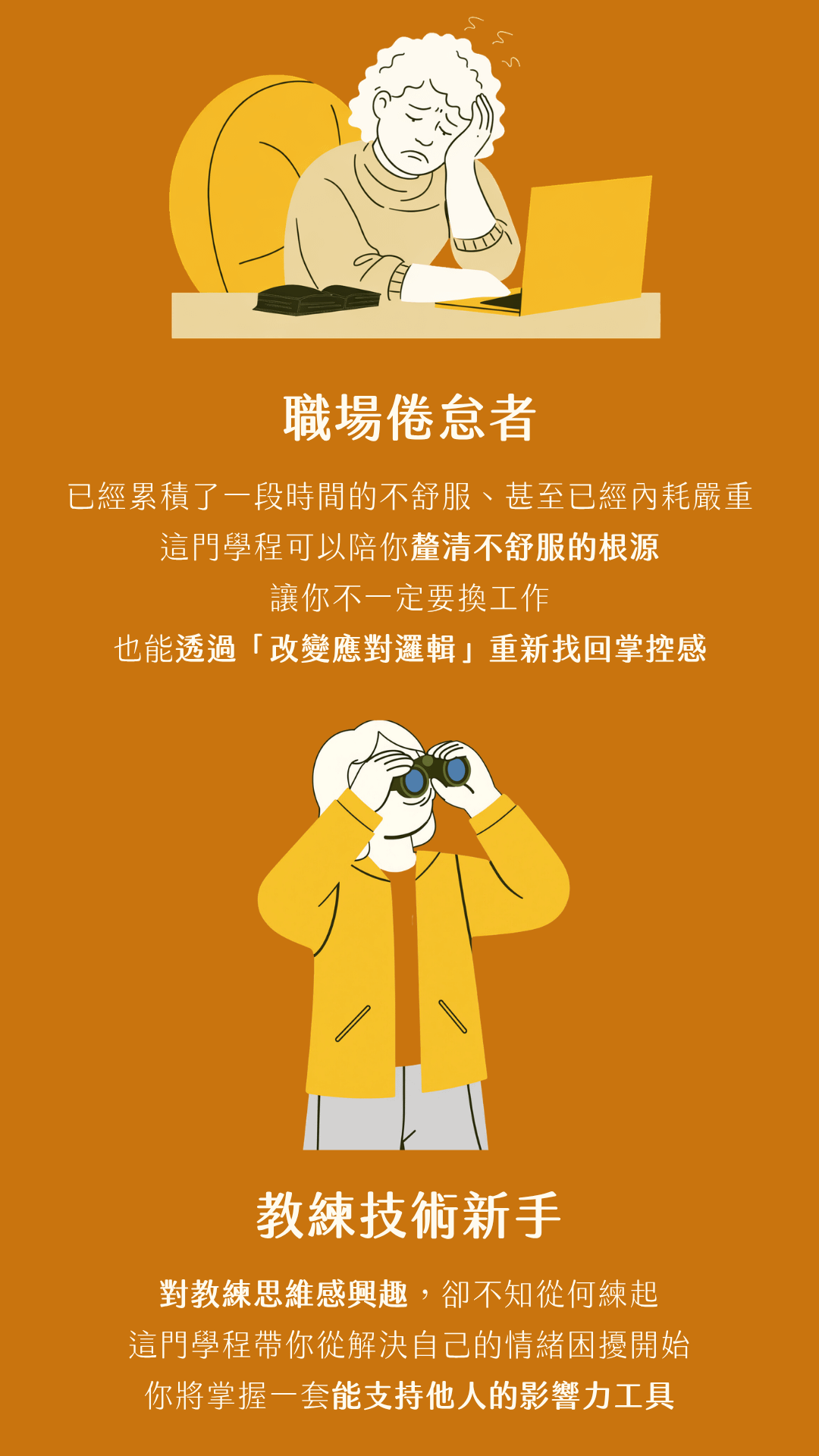 如果你不想立即發展個人教練身份,也沒有想要直接培養引導對話影響力,而是想要聚焦於眼前現狀,期待明確解決某項煩惱,同時依然對「Life Coach」、「教練力」、「Coaching Mindset」感到熱忱好奇或躍躍欲試,那麼《AndAction 學程計劃》會是非常適合你的選擇。藉由緊密又有彈性的系統性安排,加速融會貫通,邁向全方位的新時代工作者!