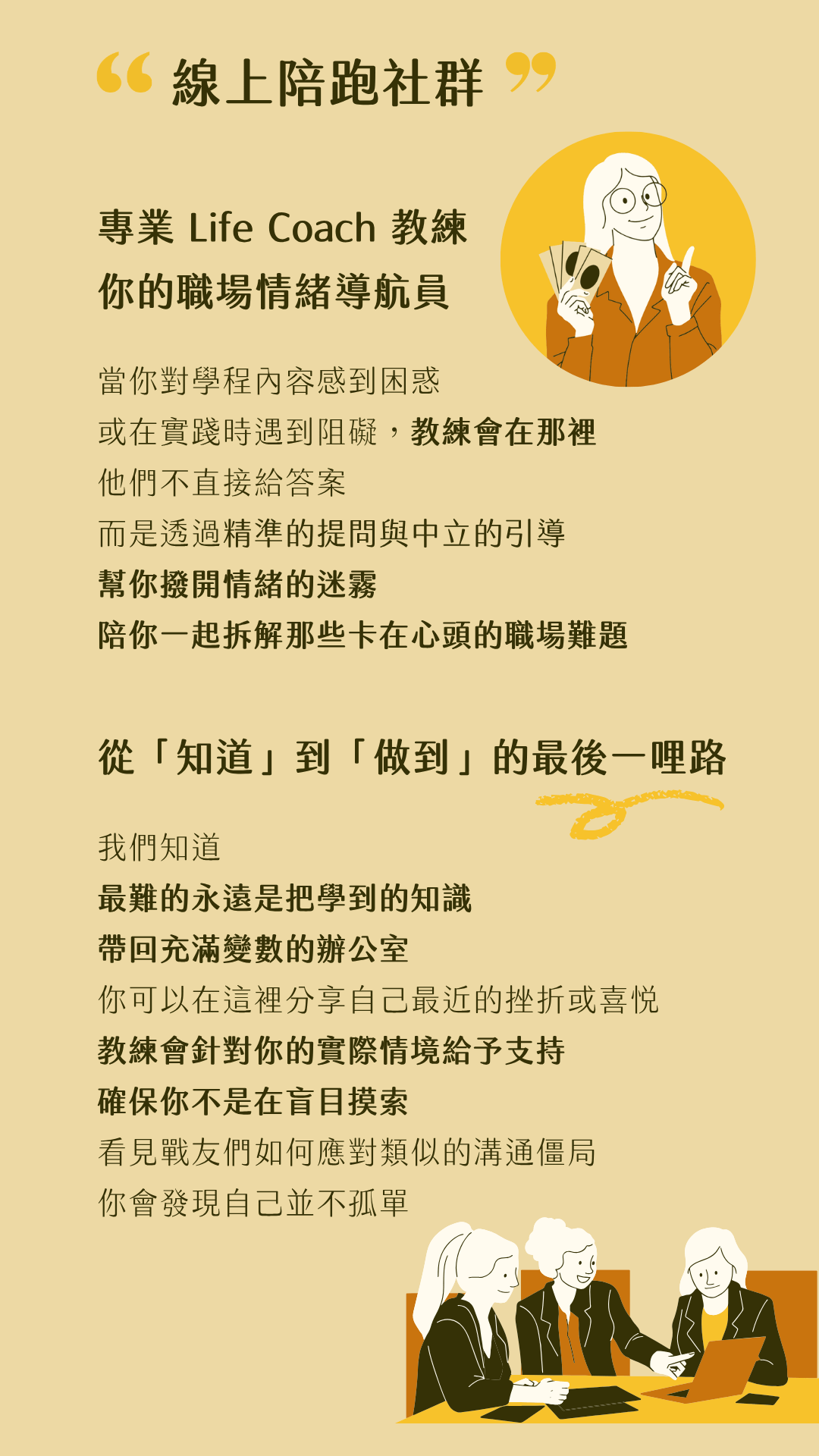 《學程計劃》並非傳統易囤積擱置的線上課程,亦非以固定日期之團體課形式進行。學員可以根據自身狀態「隨時啟動」,並全程在專屬線上社群空間紀錄與實作。在圍繞 Life Coach 的即時支持下,以數週密集短跑的形式,有效提升學以致用的路徑。