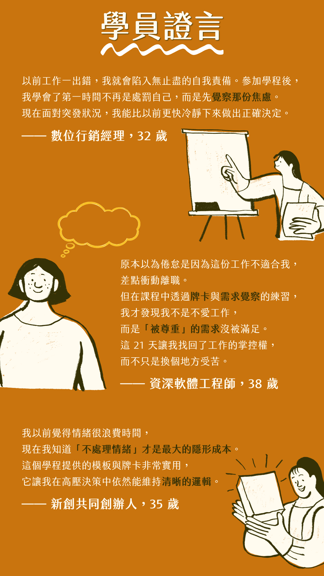 在「三週 (21天)」學習旅程結束後,我們將為你保留個人完整學程學習軌跡之學程討論區使用權限(屆時若想額外加購學程影音權限亦可),你依然可以繼續在空間中與教練和學程校友們互動交流。